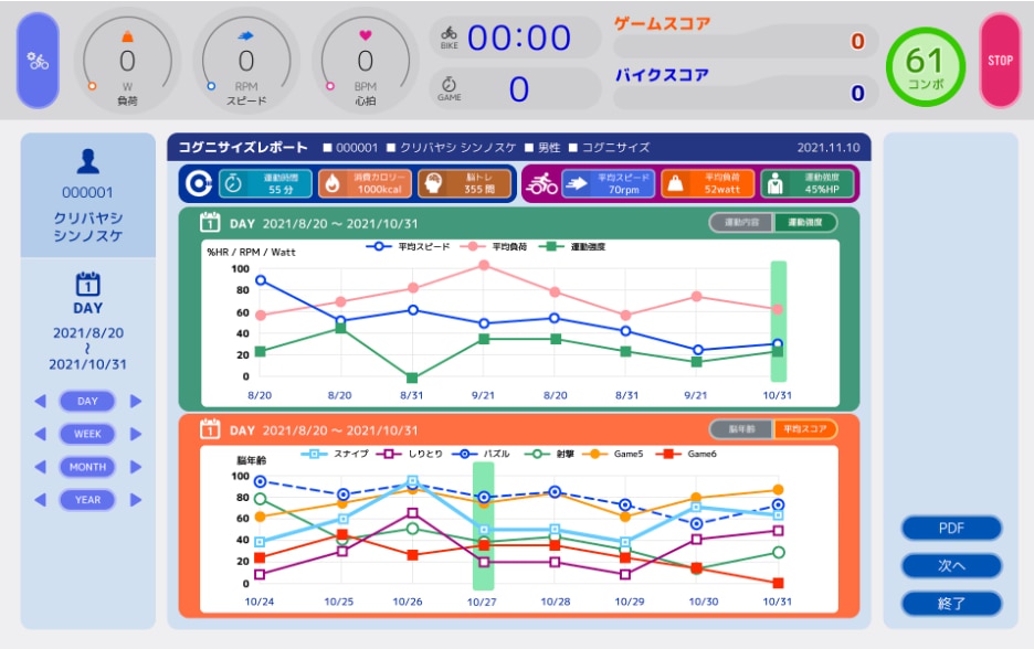 運動や課題の履歴を機器内に保存し、日・週・月単位での活動記録を確認可能。レポート出力でご家族や職員様と共有できます。