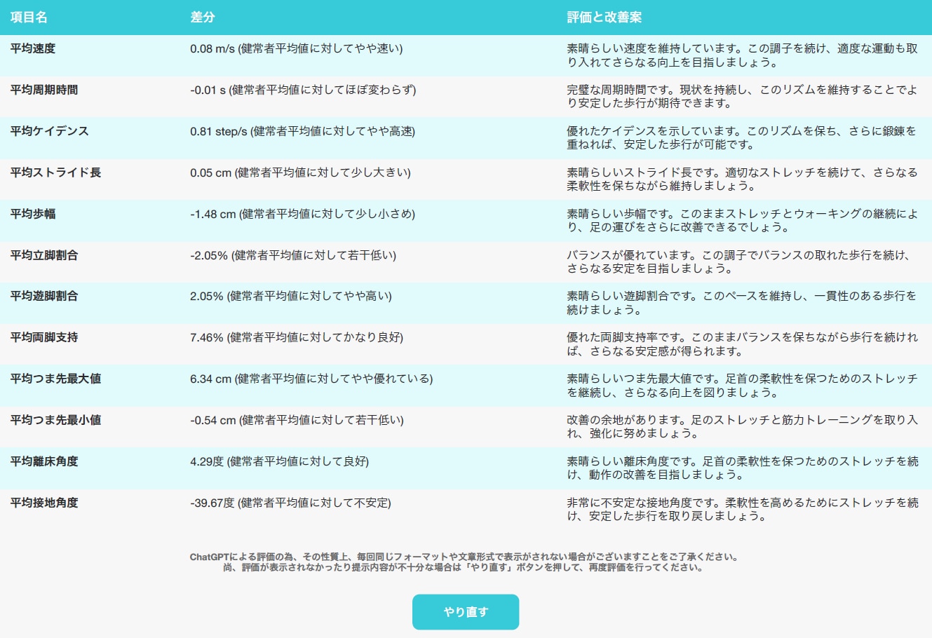 評価結果画面では、各種項目で被験者様の性別・年齢の平均と比較した評価とそれに伴うサジェスチョンを行います。判断基準の参考としてご使用いただけます。