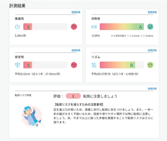 歩行レポートでは、被験者様にそのままお渡しできる総合結果と転倒リスク評価が自動で作成されます。高齢者の転倒は、昨今の社会問題にもなっており、長く健康に生きるために転倒リスクを測ることが重要となります。