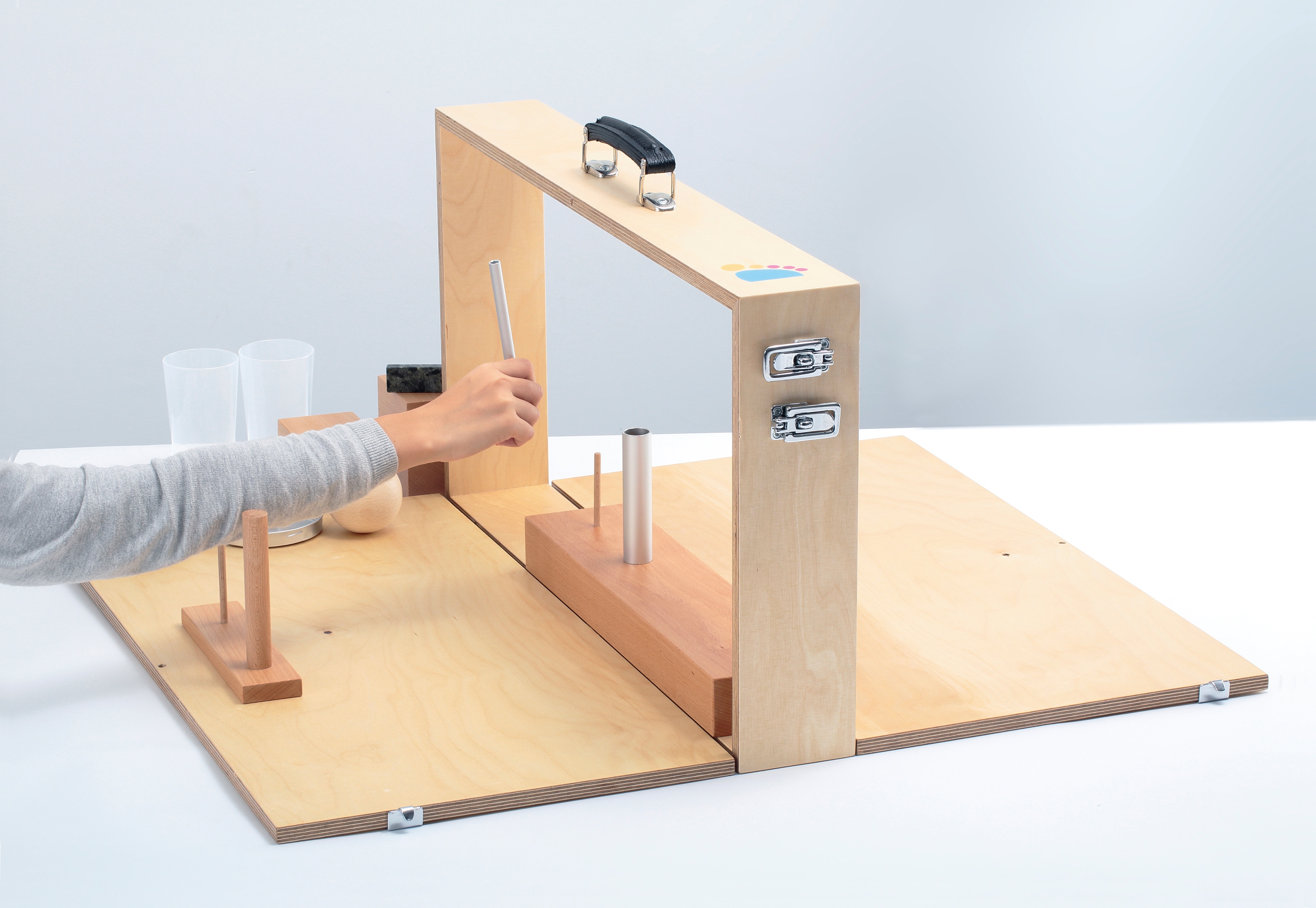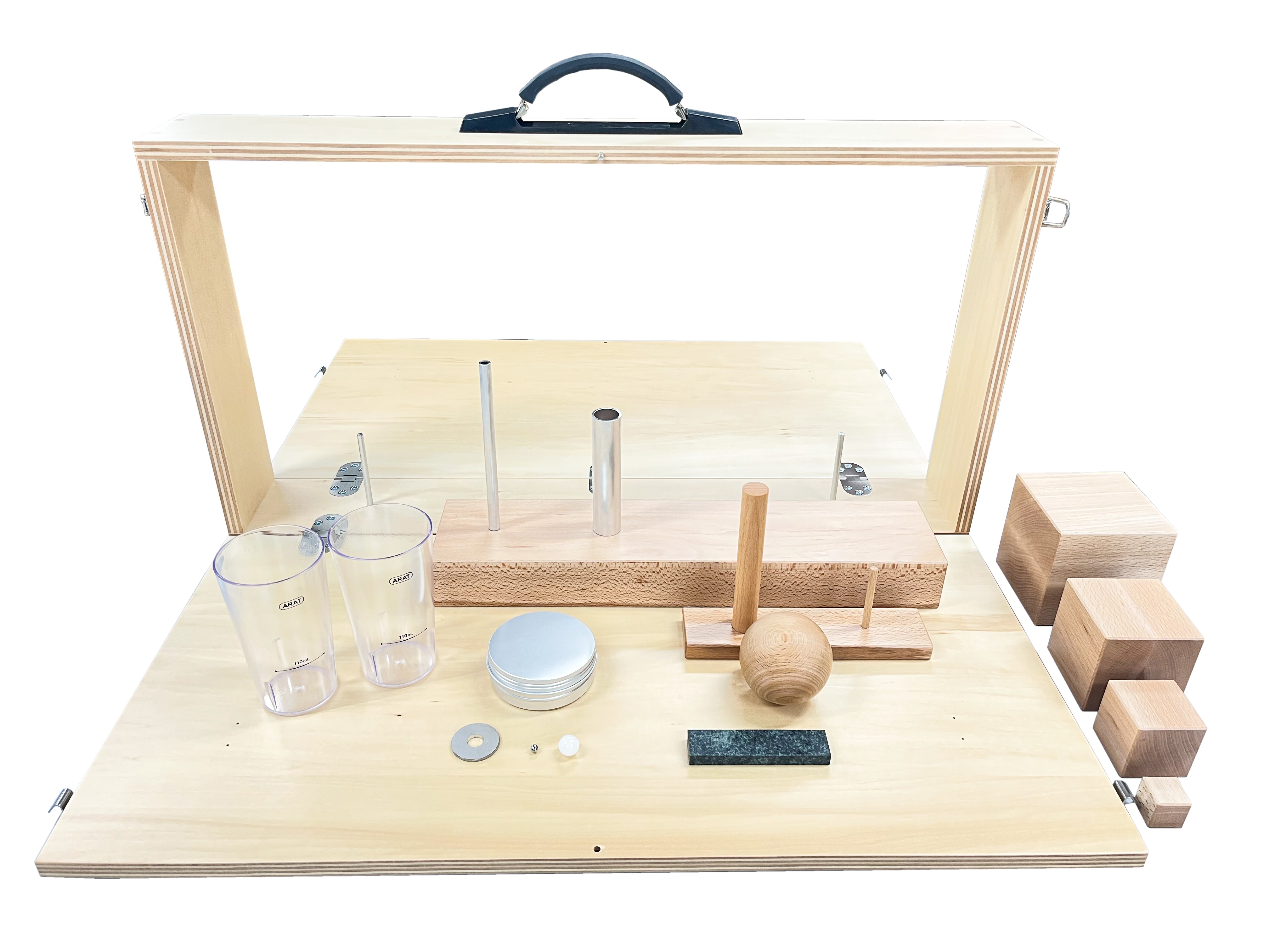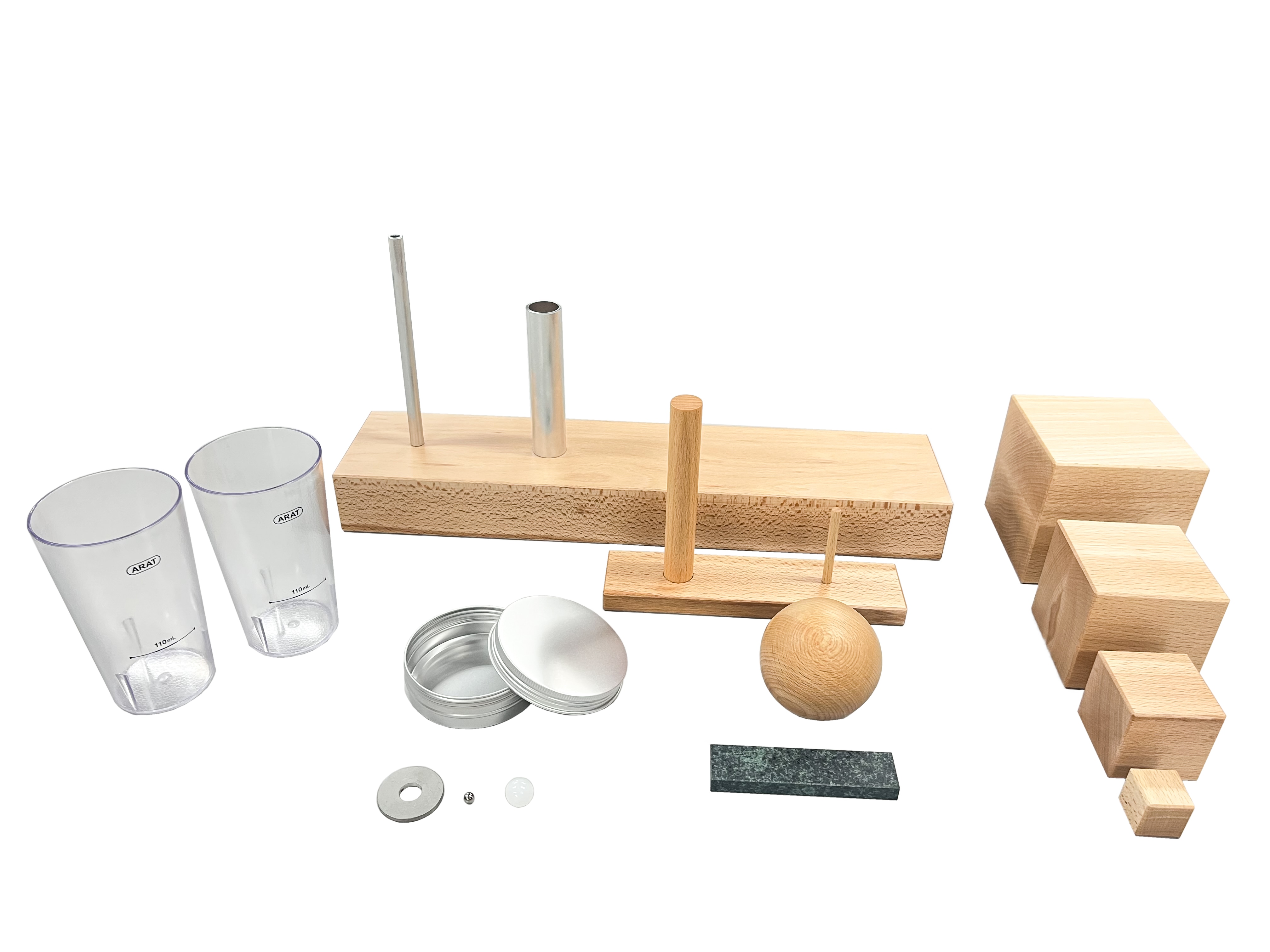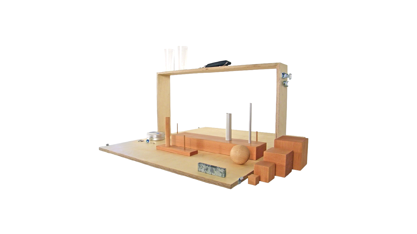 構成 | ・木製ブロック(10cm・7.5cm・5cm・2.5cm) ・クリケットボール(直径7.5cm) ・砥石 ・グラス(2個) ・円筒(直径2.25cm・1cm) ・ワッシャー ・ペグ及びペグ立て(大・小) ・金属製の容器と蓋 ・金属球 ・ビー玉 |