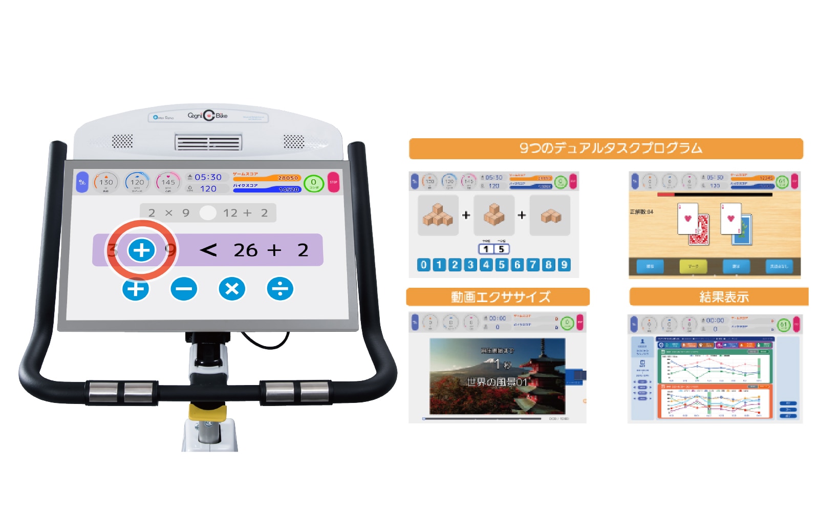 エルゴメーターによる運動と、モニター上に表示される認知課題を組み合わせて行うことができる機器です。