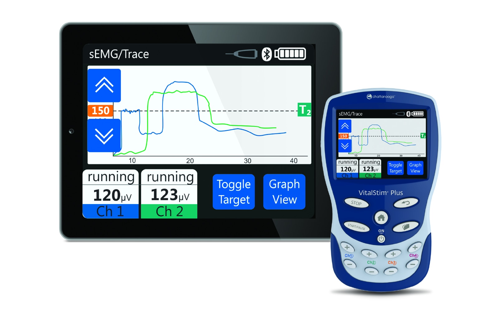 刺激レベルや実施時間などの設定項目を備え、表面筋電図(sEMG)を記録してフィードバックに活用する運用が可能です。