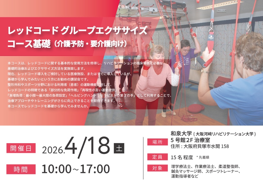 セミナー内容 | ・高齢者の各種身体機能の低下について ・フレイル(虚弱)の観点からレッドコードグループエクササイズの効果を理解する ・レッドコードの基礎的な設定方法 ・レッドコードが身体に及ぼすバイオメカ的な作用について ・基礎的な強度、難易度設定方法について ・運動指導者の指導方法のポイント、リスク管理、グループ配置について ・各種体操の作成方法(速度、音楽の設定、ポジションなど) ・グループワーク(実際に体操作成、発表) |