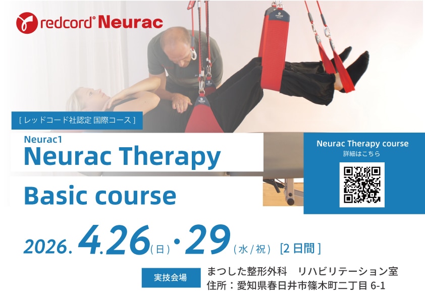 セミナー概要 | Neurac(Neuromuscular activation)コースは、Redcord社が認定する国際的な教育プログラムで、特に「Neurac Therapy Basic」コースは、Neuracメソッドの基礎を学ぶための重要なステップとなります。 |